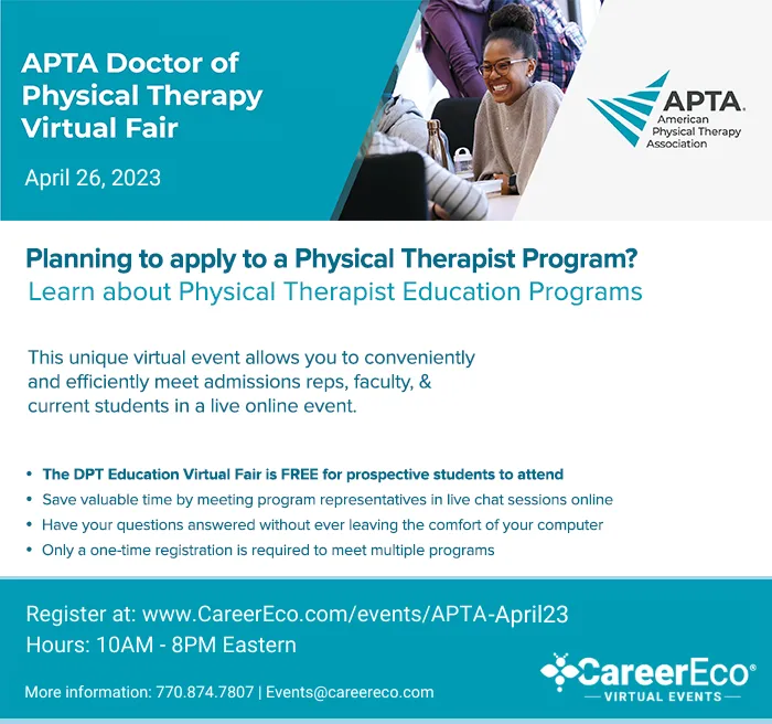 The American Physical Therapy Association (APTA) is hosting an online virtual fair for prospective DPT students to attend on Wednesday, April 26th. This fair is free for anyone interested in applying to DPT programs and will host admissions representatives from all over the United States. The fair will run from 10 AM – 8 PM Eastern time.